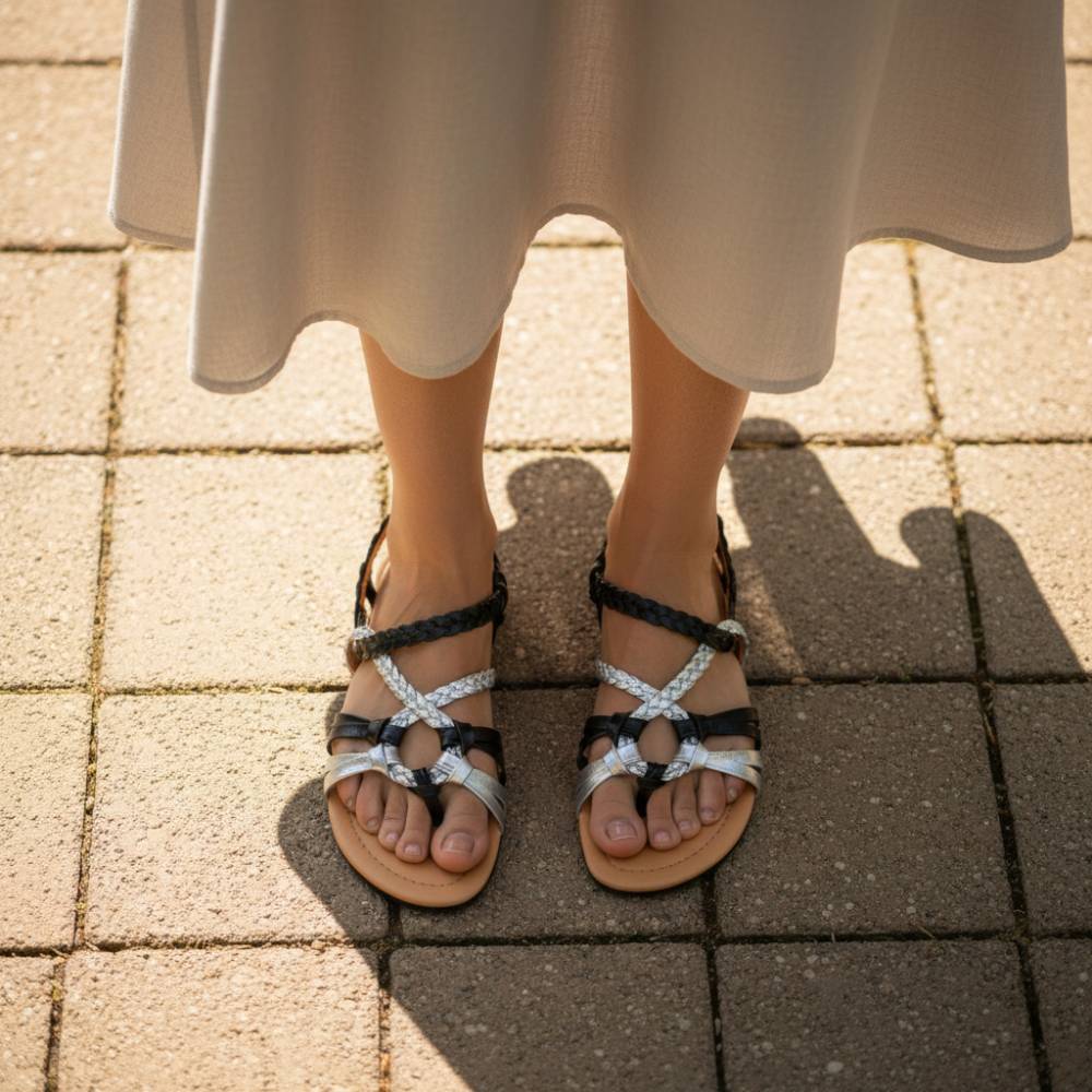 Le cinghie in nero e argento corrono in forma insolita, a volte intrecciate, a volte annodate. Questo costituisce l'aspetto femminile dei sandali a piedi nudi. E soprattutto: non devi aprire nulla per scivolare, perché abbiamo incorporato una fascia elastica sul retro del cinturino. È più facile indossare e togliere un sandalo.