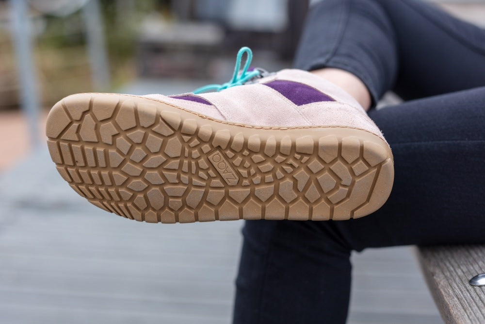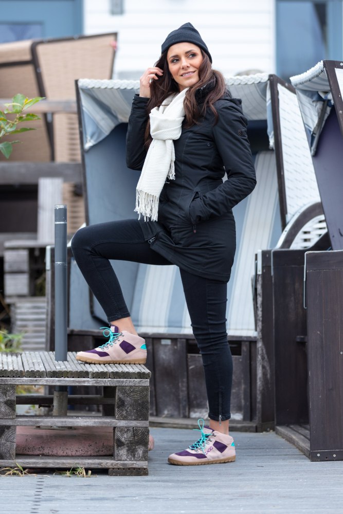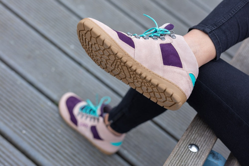 La tomaia è realizzata in pelle scamosciata di alta qualità in una combinazione di delicati nudi e viola. I dettagli turchesi sul retro e i lacci nello stesso colore rappresentano un bel contrasto. ZAQQ Membrana che è vento e impermeabile e traspirante.