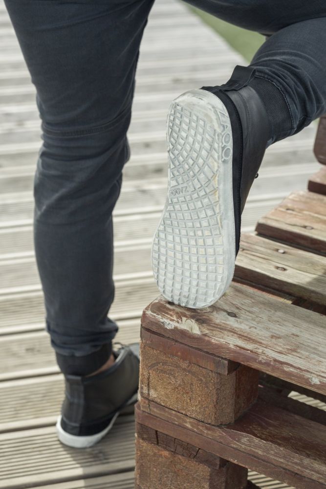 Il materiale superiore della tua sneaker a piedi nudi Quitman è costituito da una pelle nappa nera di alta qualità con uno speciale dettaglio di velluto, che rende la scarpa otticamente così attraente: proprio sopra la suola abbiamo cucito un elemento di pelle scamosciata finemente levigata. Questo fa apparire la scarpa più stretta nella parte anteriore. In effetti, tuttavia, offre molto volume per le dita dei piedi e le balle nella scarpa anteriore.