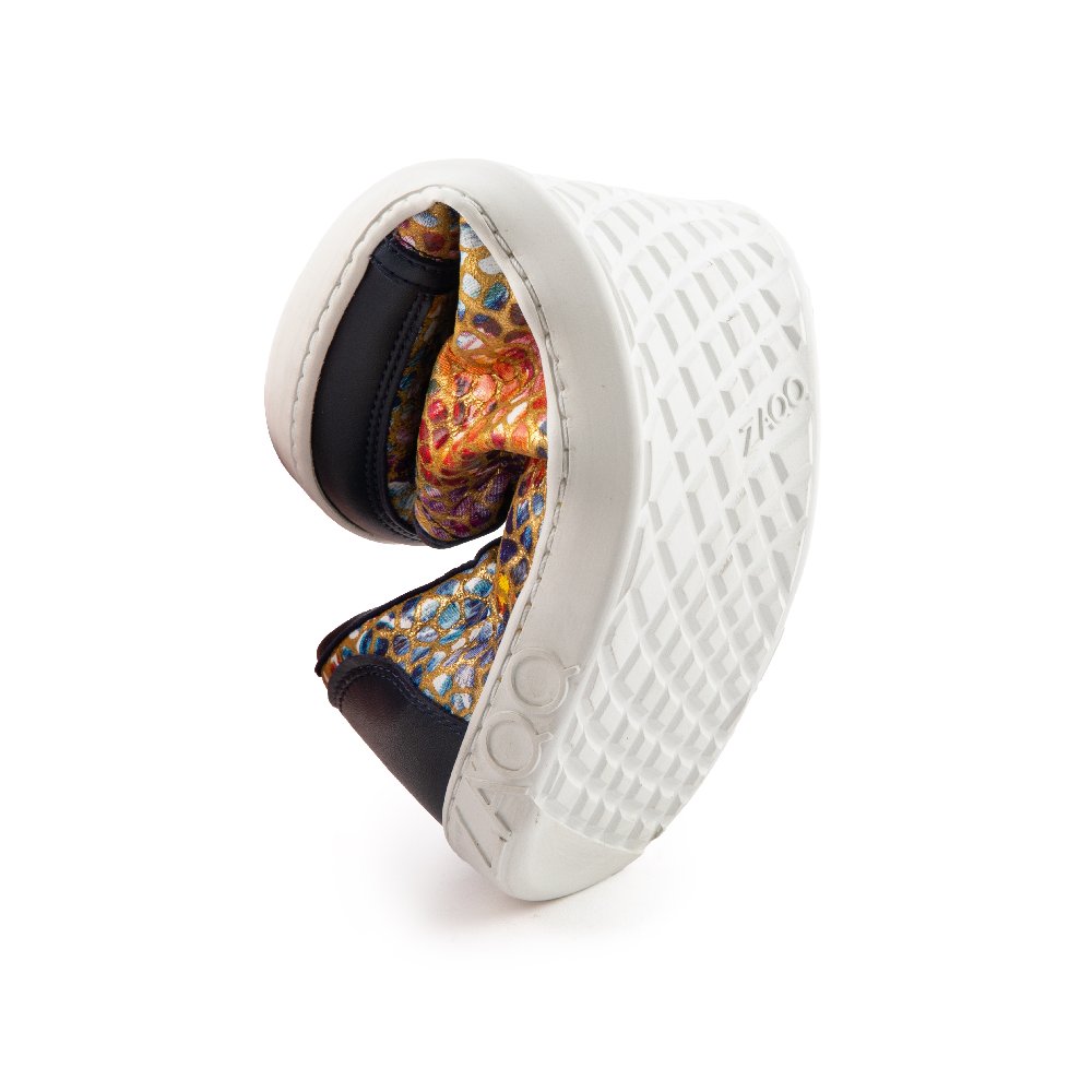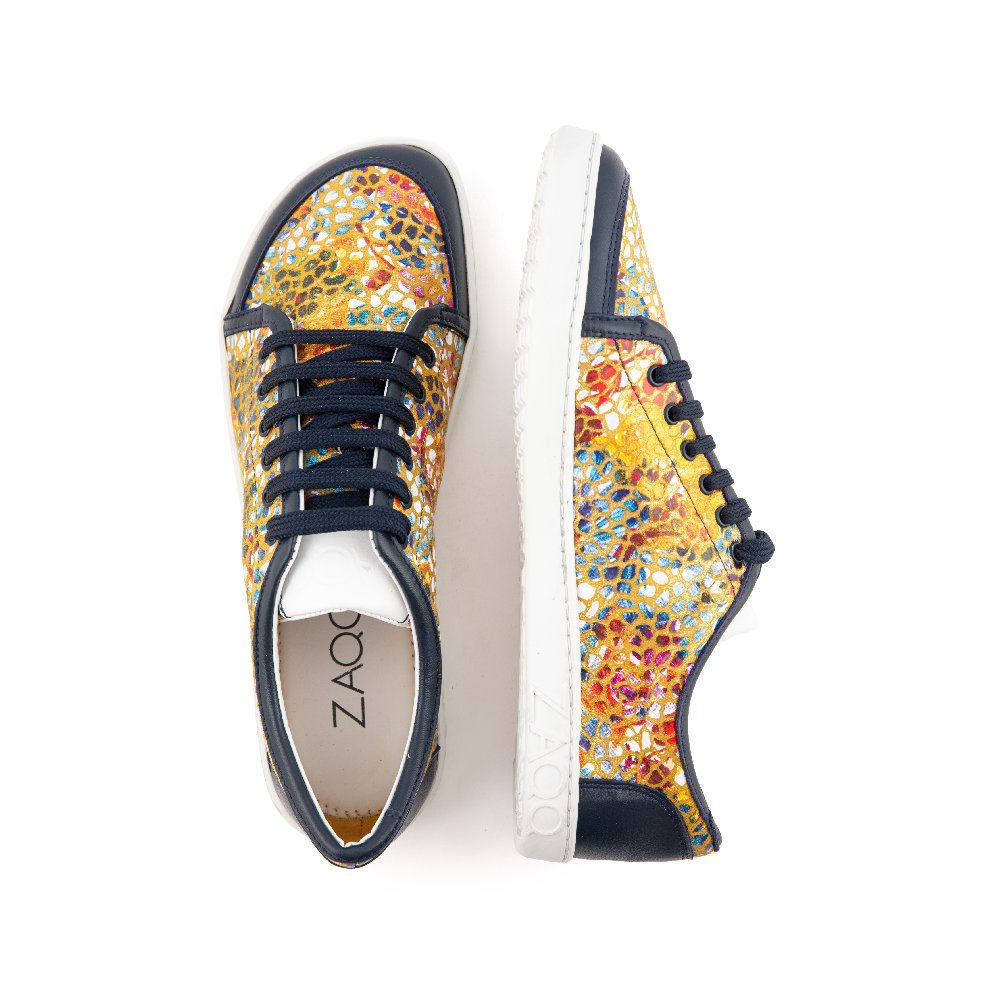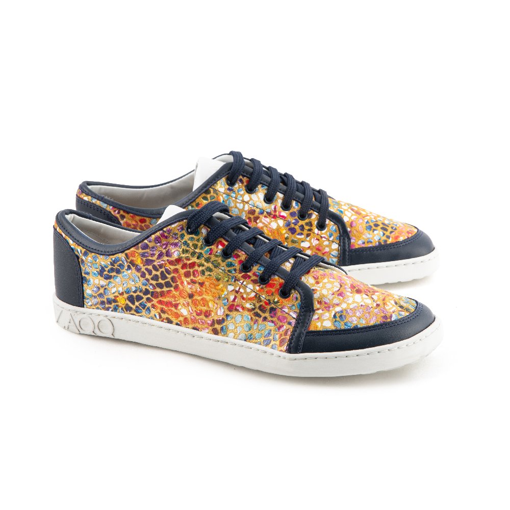 Realizzata in pelle Nappa di alta qualità con un motivo colorato di fiori e dettagli offset in blu scuro, questa scarpa a piedi nudi è un occhio assoluto! Ma questa sneaker è anche fenomenale per i tuoi piedi: offre molto spazio per le dita dei piedi e allo stesso tempo la presa sicura sulle caviglie.