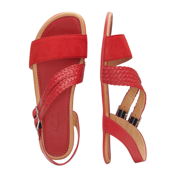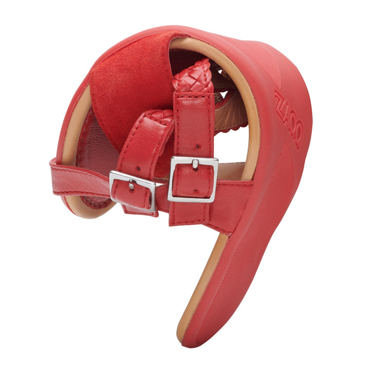 Das besondere an unserem BROOQE ist die Riemchenführung. Dadurch sieht Dein Fuß nicht nur besonders schmal in der Barfußsandale aus, sondern hat auch den perfekten Halt. An den zwei Riemchen mit geflochtener Struktur haben wir Schnallen angebracht, um die rote Sandale perfekt auf Deine Fußform einstellen zu können. In der Kombination mit dem breiten Vorderstreifen aus Veloursleder sieht unser BROOQE besonders edel aus.