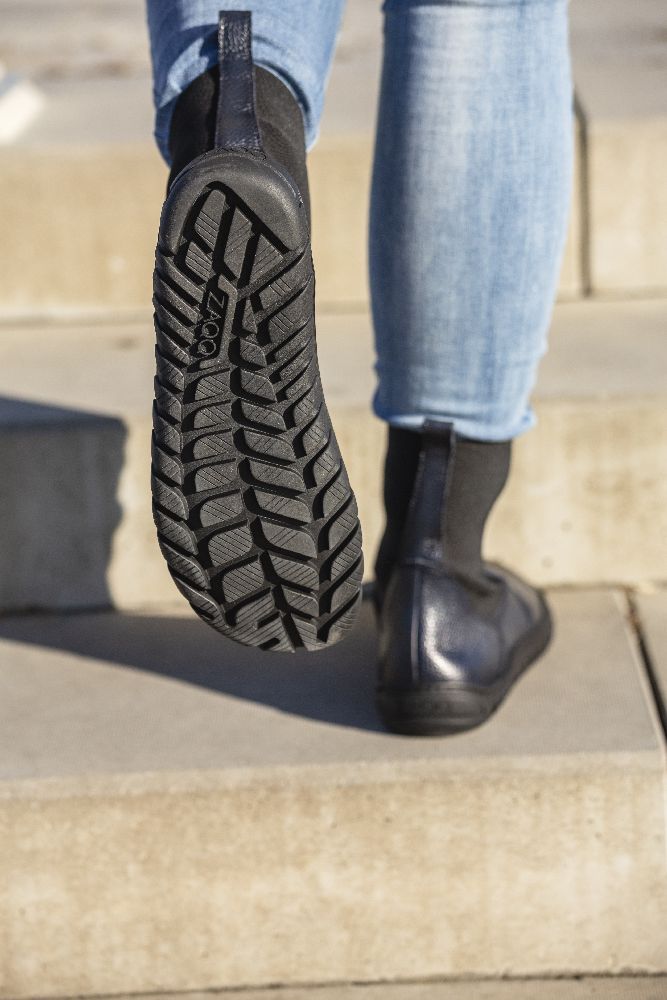 - Kautschuksohle mit Nullabsatz, dadurch Entlastung der Wirbelsäule und Schonung der Gelenke, unterstützt die natürliche Körperhaltung