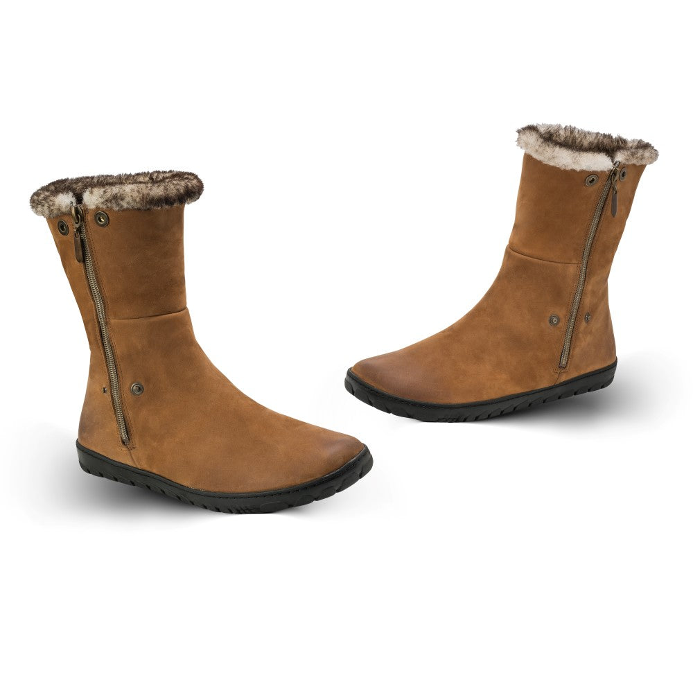 Das Cognac-farbene Veloursleder als Obermaterial und das Beigefarbene Fellimitat als Futter, verleihen dem Barfuß Stiefel ein feines und elegantes Erscheinungsbild. Die Kautschuksohle dient mit ihrer Flexibilität und dem integrierten Nullabsatz bei jedem Schritt für absoluten Geh-Komfort und eine Entlastung der Wirbelsäule.