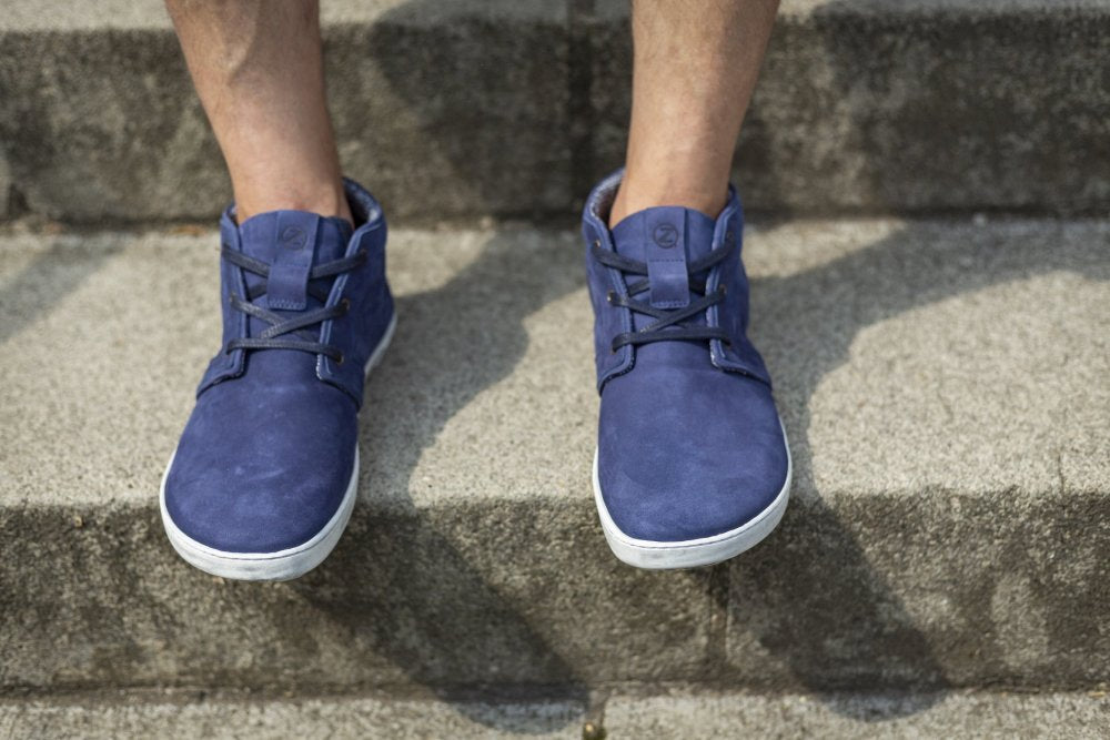 Dieser halbhohe Barfußschuh für Herren ist aus samtigem Veloursleder gefertigt. Das dunkelblaue Design bekommt mit der weißen Sohle einen sportlich-modernen Touch. Innen haben wir besonders weiches und atmungsaktives Baumwollgewebe vernäht, welches sich einfach wunderbar anfühlt.