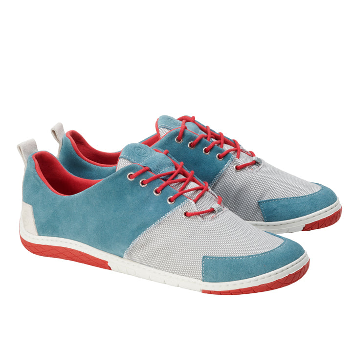 Das helle Blau, gepaart mit roten Schnürsenkeln, die nicht nur als Eyecatcher dienen, sondern auch eine sichere Schnürung ermöglichen, und den hellgrauen Einsätzen, machen diesen Barfuß-Sneaker zu einem wahren Hingucker!