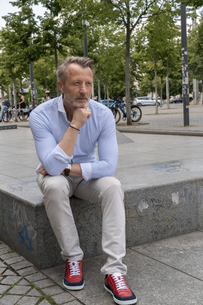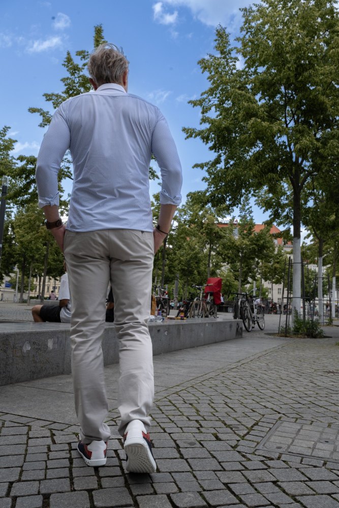 Die drei verschiedenen Farben sind perfekt aufeinander abgestimmt. Rund um die Sohle verläuft ein schmaler Streifen aus robustem Veloursleder, der die besonders sensiblen Bereiche des Barfußschuhs perfekt schützt. Das daran per Hand vernähte Nappaleder bekommt durch die entgegengesetzten Ziernähte einen leichten Vintage-Look.