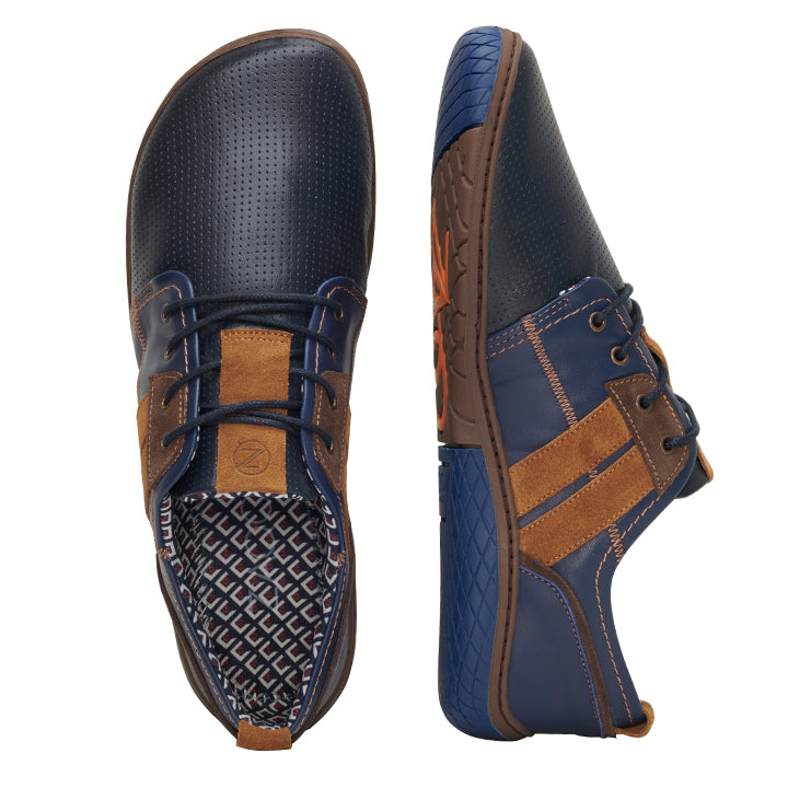 Der dunkelblaue Barfußschuh sieht mit den braunen Akzenten zeitlos und trotzdem modern aus. Herrlich wandelbar kannst Du ihn sportlich zur Used Jeans oder auch elegant zur Chino- oder Anzughose tragen.