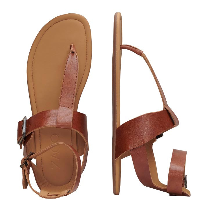 Die Barfußsandale bietet besonderen Halt durch einen schmalen Zehensteg, dessen Riemchen aus braunem Nappaleder zur Riemchenkonstruktion am Fußgelenk führt.