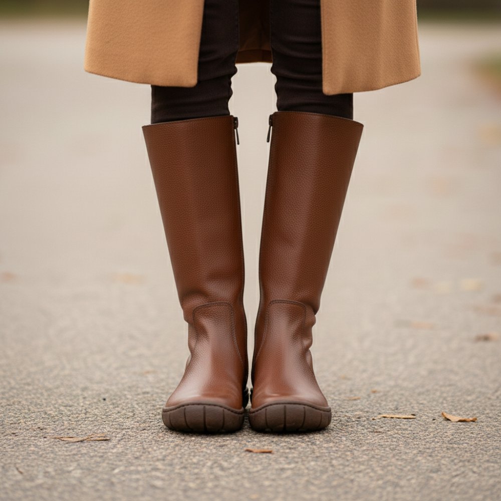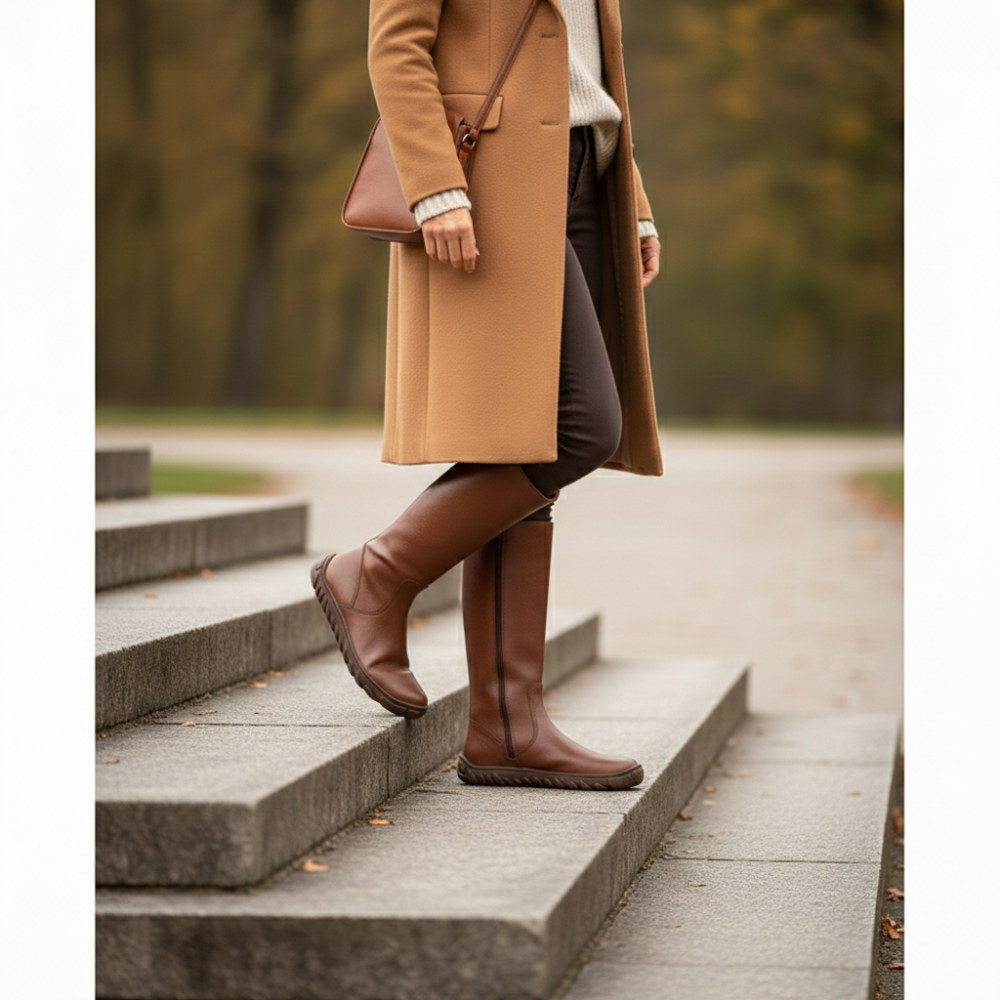 QAZZ Brown ist Dein neues Must-have, da diese Stiefel Eleganz mit dem Komfort von Barfußschuhen verbinden. Ihr schlichtes Design in einem warmen Braunton macht sie zu einem vielseitigen Begleiter, der sich mühelos in jeden Look einfügt. Gefertigt aus erstklassigem Nappaleder, stehen diese hohen Stiefel nicht nur für Stil, sondern auch für Qualität, die lange hält.