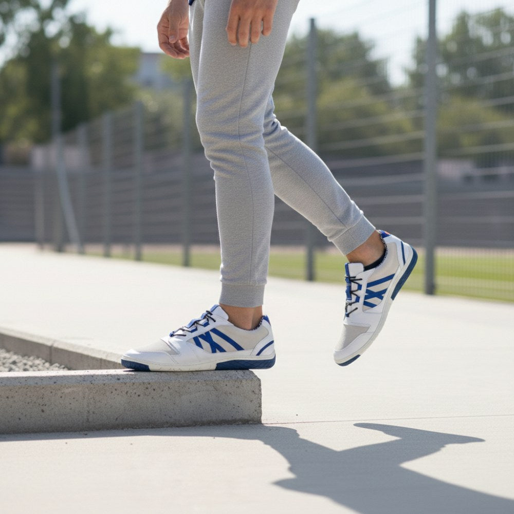Dieser Barfußschuh besteht aus feinem, samtigem Veloursleder kombiniert mit glänzendem Nappaleder und abgesetzt mit blauen Akzenten. Frisch und hochmodern sieht dieser weiße Sneaker damit aus.