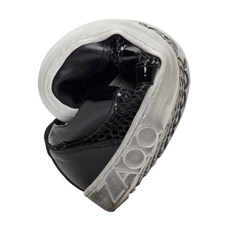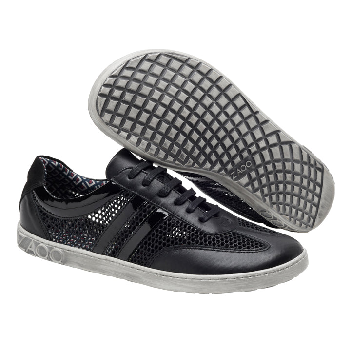 Dieser Barfußschuh für Damen ist in seinem durchgängig schwarzen Farbton schlicht, aber keinesfalls langweilig. Das Lackleder an den Seiten und am Einstieg sorgt für einen aufregenden Look und komplettiert die perforierte Struktur des Meshgewebes in Perfektion.