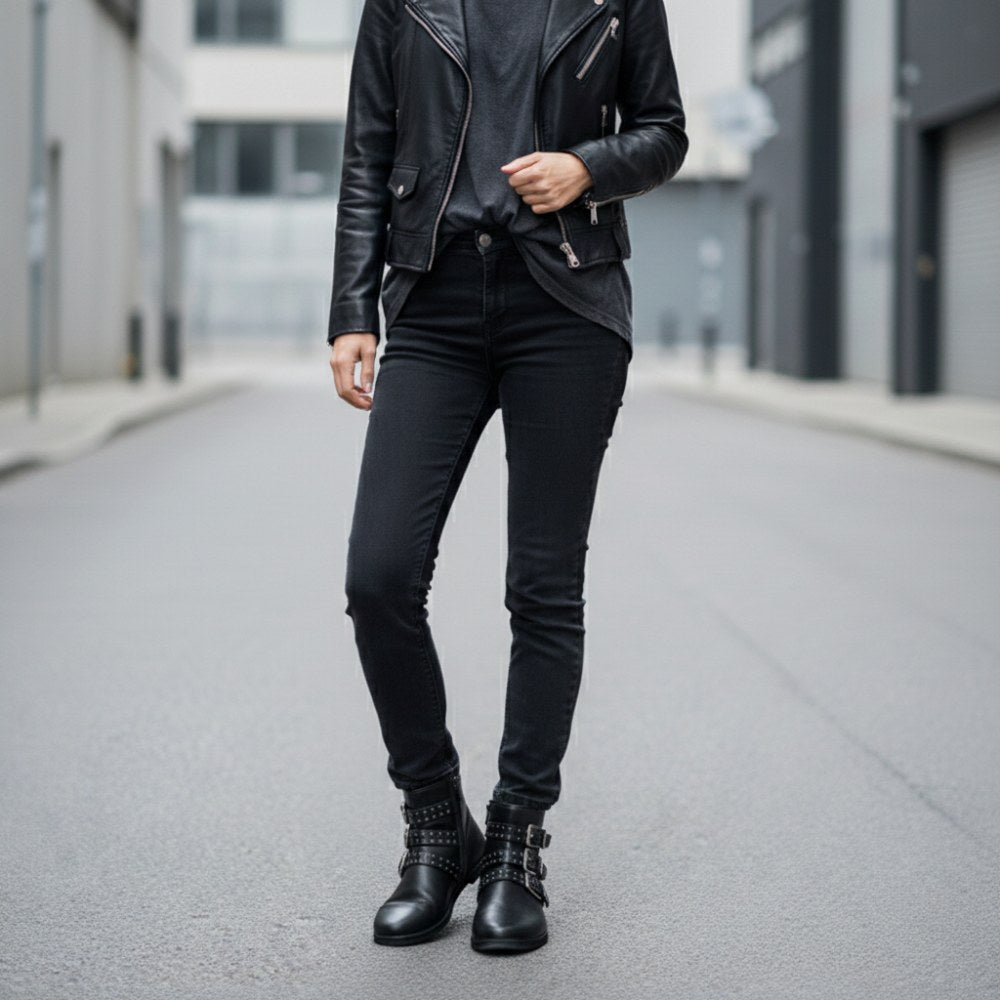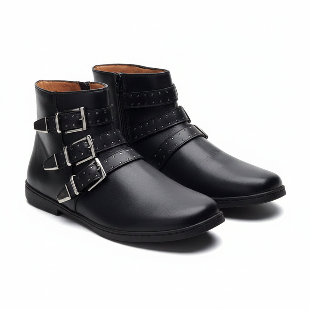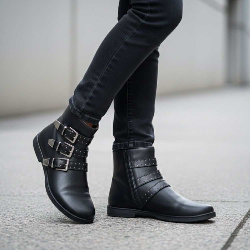 Durch die drei Schnallen sieht dieser Barfuß-Boot aber trotzdem rockig aus und passt perfekt zu lässigen Jeanslooks.