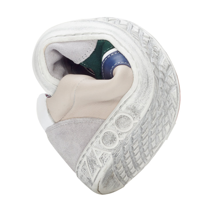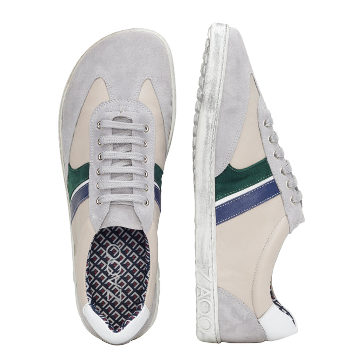 Das graue Veloursleder gibt unserem QLAUDE einen schönen Rahmen, indem das beigefarbene Nappaleder mit den aufgesetzten Streifen in grün und blau perfekt zur Geltung kommt. Mit diesem Farb- und Materialmix sieht dieser Sneaker nicht nur besonders schnittig aus, sondern auch extrem wertig! Und das ist er in der Tat auch, denn für QLAUDE verwenden für nur die besten Materialien.