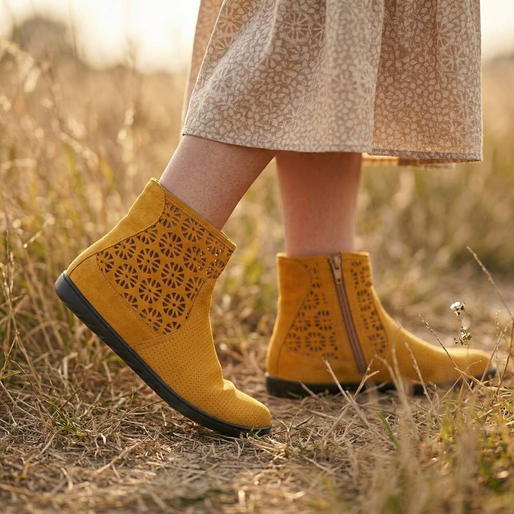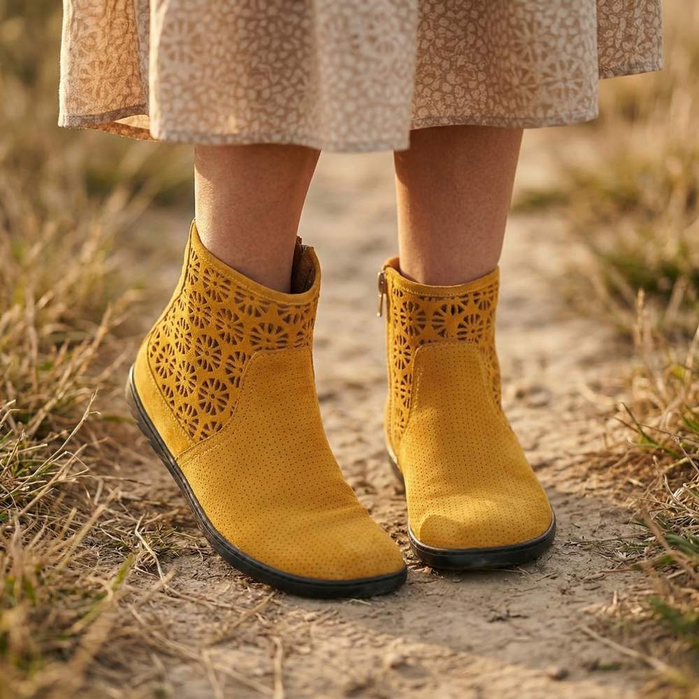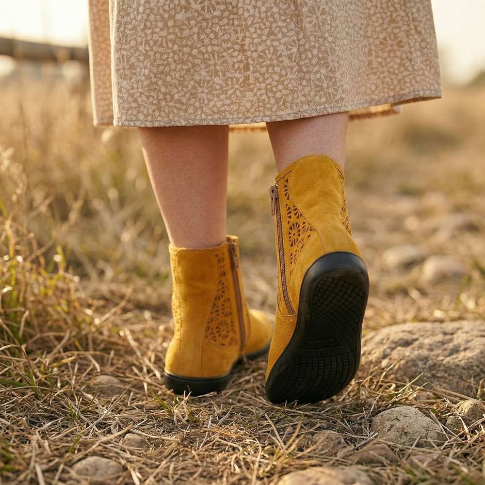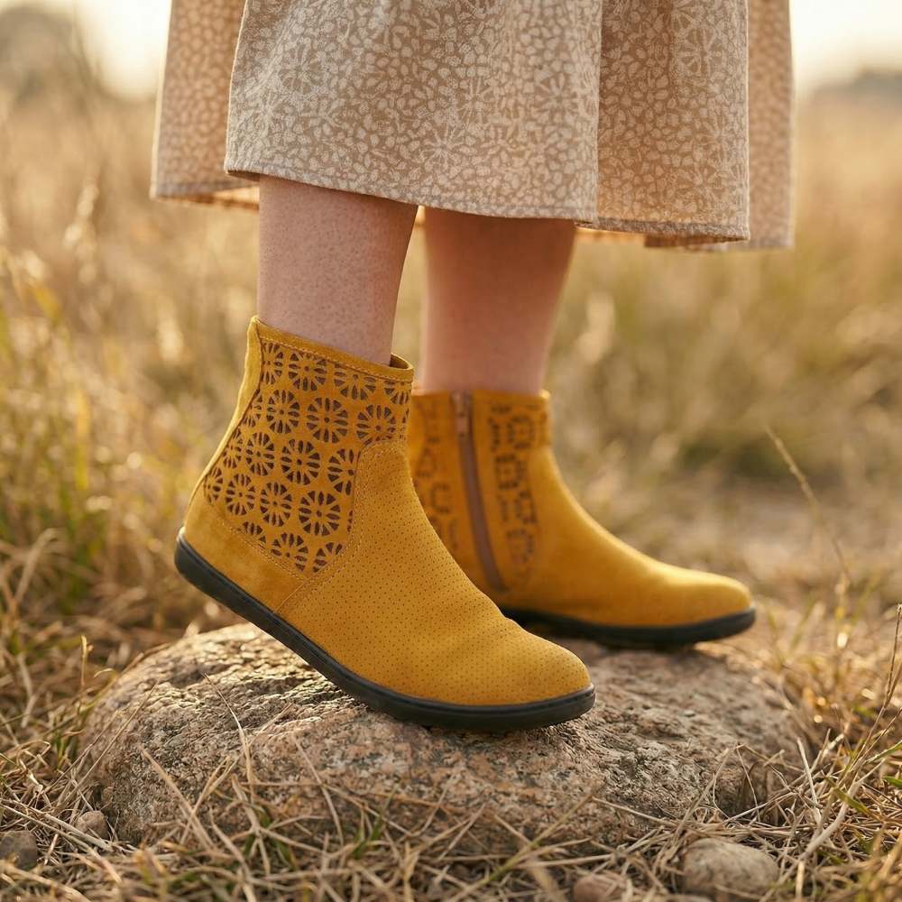 QYLIE Camel ist der stylische und besonders feminine Boot, der sich als megabequemer Barfußschuh entpuppt. Mit dem warmen Gelb-Braunton bringst Du Farbe in Dein Outfit ohne zu sehr aufzufallen.