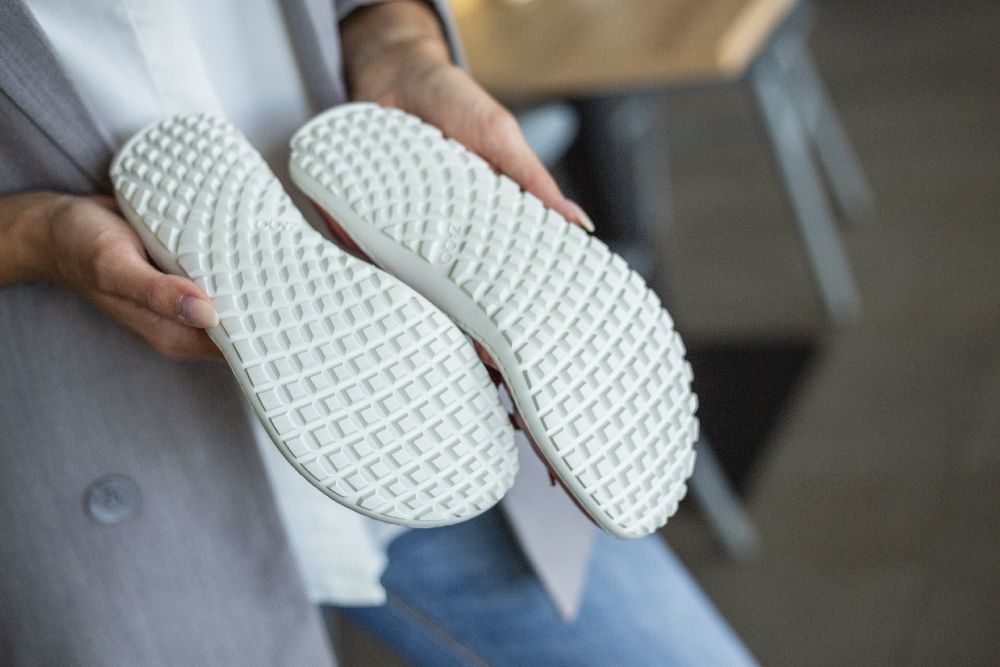 Kautschuksohle mit Nullabsatz, dadurch Entlastung der Wirbelsäule und Schonung der Gelenke, unterstützt die natürliche Körperhaltung