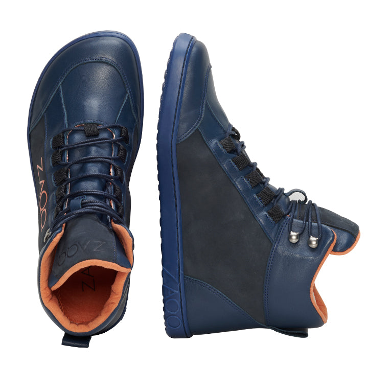 Moderne Männer, die mit beiden Beinen im Leben stehen, aber trotzdem gern etwas wagen, haben ihren Schnürboot gefunden. Das dunkelblaue Premiumleder wird mit dem herausschauenden Innenfutter in Orange aufgewertet. Damit Du auch stolz nach außen zeigen kannst, dass Du Wert auf Qualität und Nachhaltigkeit legst, haben wir unseren Schriftzug bei diesem Modell besonders betont. Damit bekommt dieser Barfußschuh seinen ultramodernen und sportlichen Look.